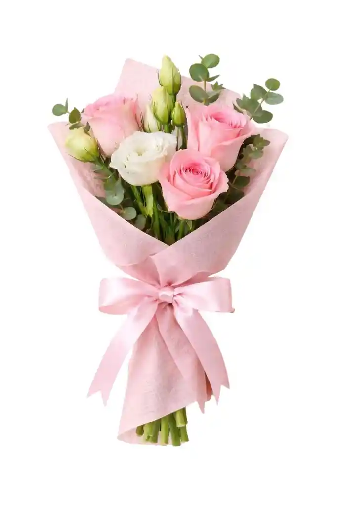 Ramo mini con 3 unidades de rosas rosadas y 1 vara de rosas blanca y follaje de eucalipto