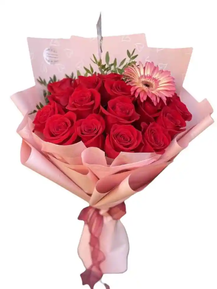 Bouquet floral con 12 unidades de rosas rojas y 1 unidad de gerbera rosada mas follaje en papel coreano rosado