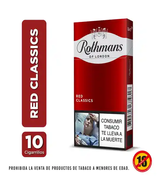 1 cajetilla de 10 cigarrillos Rothmans Red Classics. Sabor tabaco regular Producto exclusivo para mayores de edad. El tabaco es nocivo para la salud.
