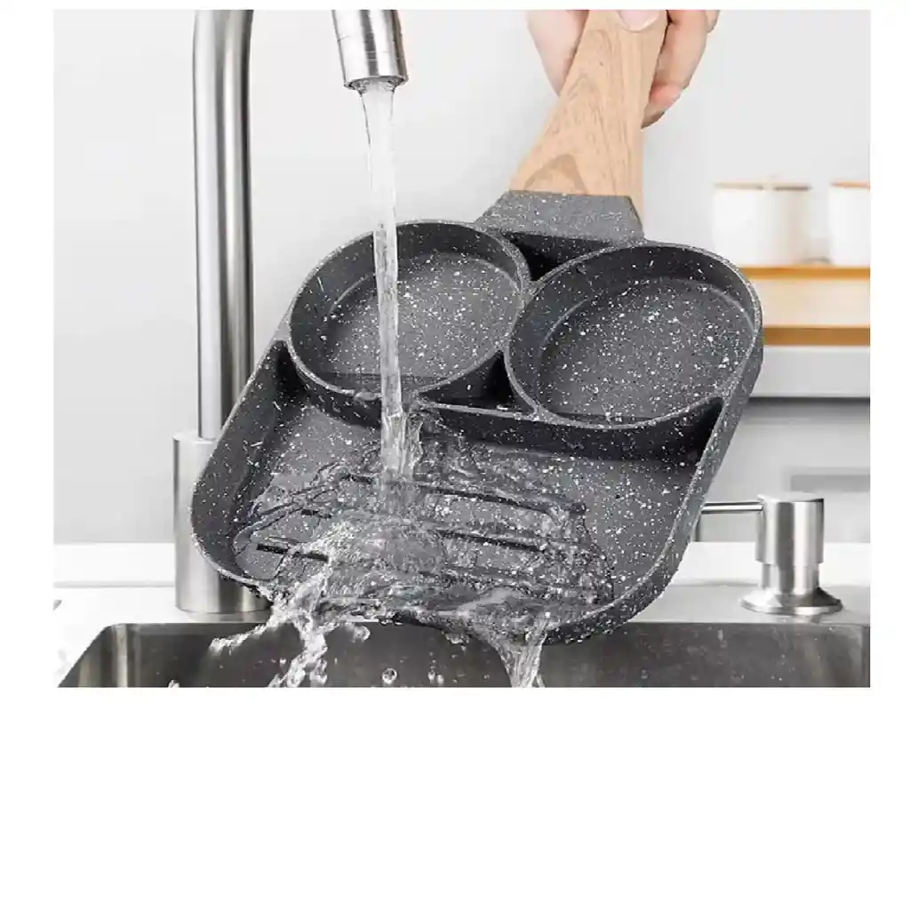 Sartén Antiadherente Multiusos 3 En 1 Para Huevos Carne Sartén antiadherente para huevos , Sartén antiadherente 3 en 1 con parrilla dividida, mango resistente al calor. Sartén para preparar Huevos, Tortillas, Arepas, Pancakes, salchichas, tocineta, carne, pollo y mucho mas!!! Este sartén esta construido con un revestimiento de piedra, mango de baquelita (textura de grano de madera) cuenta con aislamiento térmico, agarre cómodo y anti-quemaduras. Este sartén cuenta con materiales premium, que se caracteriza por la lograr conducir de manera uniforme el calor, es práctico para la mayoría de las estufas. Usos múltiples: Este sartén es muy practico para preparar Huevos, Tortillas, Arepas, Pancakes, Hamburguesas entre otros, cuenta con 4 compartimentos para que cocinar sea rápido y fácil. El revestimiento cerámico es fácil de limpiar, freír es más fácil y saludable, mientras que lavar es menos complicado.