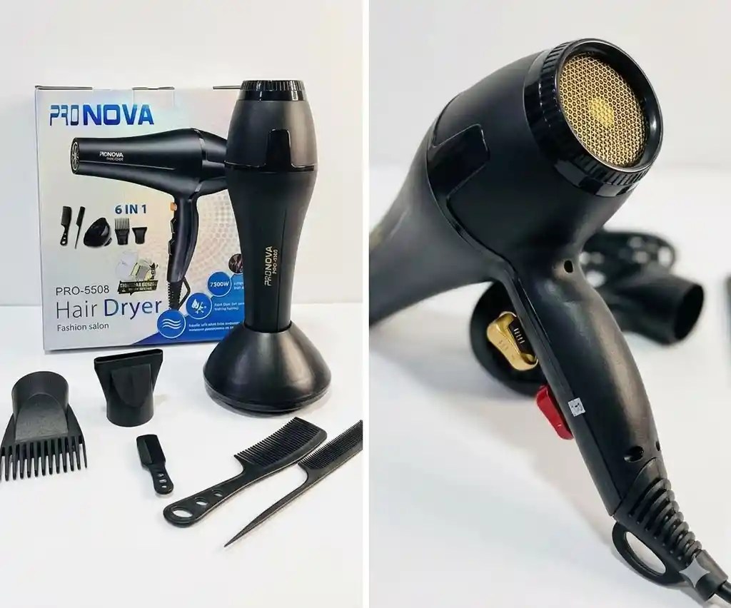 Potencia: 7500W para un secado rápido. Accesorios: Incluye difusor y boquillas para diferentes estilos. Funcionalidades: Cuenta con configuración de aire frío y caliente. Uso: Diseñado para uso doméstico o profesional en salones de belleza. Accesorios: Es un sistema "6 en 1", lo que significa que incluye varios accesorios para diferentes estilos de peinado, como se ve en la imagen (difusor, boquilla concentradora, peines, etc.). Funciones de aire: Cuenta con aire frío para fijar y dar un estilo duradero al peinado. Proporciona un "viento suave y saludable" que ayuda a mantener la humedad del cabello. Uso: Diseñado para uso profesional de salón, adecuado para todo tipo de cabello.