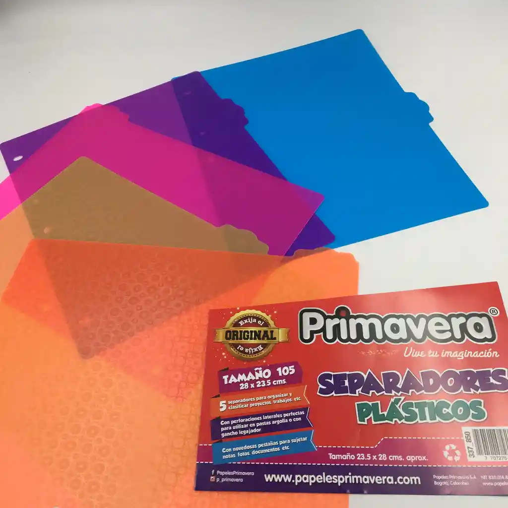 Organiza tus documentos de forma práctica, rápida y profesional con el separador plástico de hojas y archivo Primavera, diseñado para mantener tus proyectos siempre en orden. Su material resistente, sus pestañas funcionales y su compatibilidad con diferentes sistemas de archivo lo convierten en un accesorio imprescindible en oficinas, estudios, colegios y hogares. ¿Qué es? Es un separador plástico tipo archivador, elaborado en material flexible y duradero, ideal para clasificar documentos dentro de carpetas tipo argolla o legajador. Incluye 5 separadores que permiten organizar por categorías, colores o asignaturas, brindando un manejo más eficiente de la información. Ficha Técnica Marca: Primavera (100% original) Tamaño: 28 x 23.5 cm Material: Plástico resistente y fácil de limpiar Contenido: Juego de 5 separadores Perforación lateral: Compatible con pastas argolla y sistemas de gancho legajador Pestañas novedosas: Útiles para sujetar notas, fotos, documentos pequeños u hojas destacadas Uso: Archivadores tamaño carta u oficio (según carpeta)