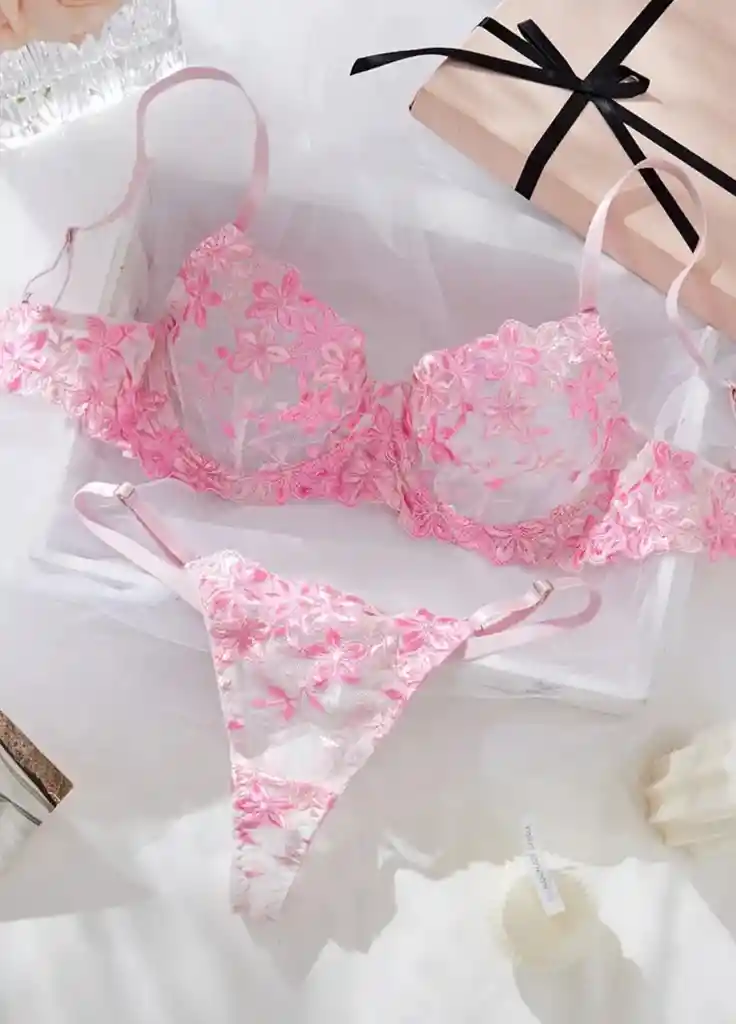 TALLA S “Romántico, delicado y con un toque atrevido” Este set de lencería en rosa suave con bordado floral es perfecto para sentirte femenina y segura. Su diseño delicado resalta las curvas de forma sutil y coqueta, ligero, cómodo y muy sensual, es de esos conjuntos que elevan el ánimo con solo ponértelo.