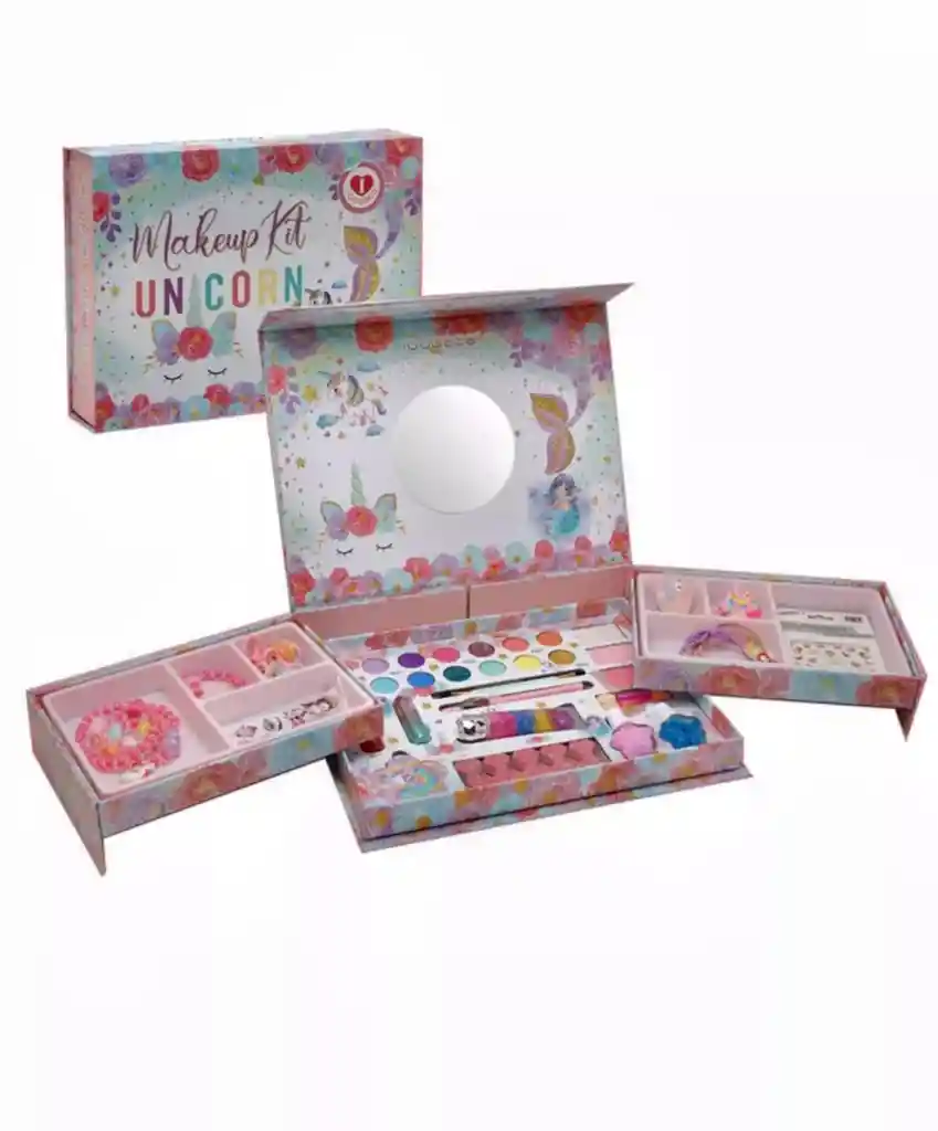 Kit de maquillaje para niños incluye gran variedas paleta de sombras ,Gemas brillos ,esmaltes ,accesorios para el cabello y stiker . Kit de maquillaje para niños Juguetes para niñas El diseño exterior suave hace que no sea fácil dañarse y protege las suaves manos de los niños Solo use una toalla de papel húmeda para limpiar suavemente y eliminar por completo cualquier resto de maquillaje. Kit de juguetes .caja de cosméticos portátil : caja apilable de 3 capas. ¡Este juego de juguetes de maquillaje lavable ayudará a cumplir los sueños de maquillaje de su hijo! Este juego infantil satisfará su curiosidad por la cosmética. Nuestro diseño compacto y portátil hace que sea fácil llevar nuestro kit de maquillaje a donde quiera que vaya, para que su hijo pueda disfrutar de infinitas horas de juego imaginativo dondequiera que vaya. Da vida al set de maquillaje de princesa para cada niña.