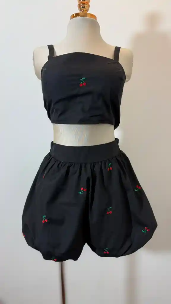 set de crop top y short tipo globo con cerezas bordadas, la parte posterior tanto del crop top como del short viene con resorte para que se ajuste facilmente a tu cuerpo