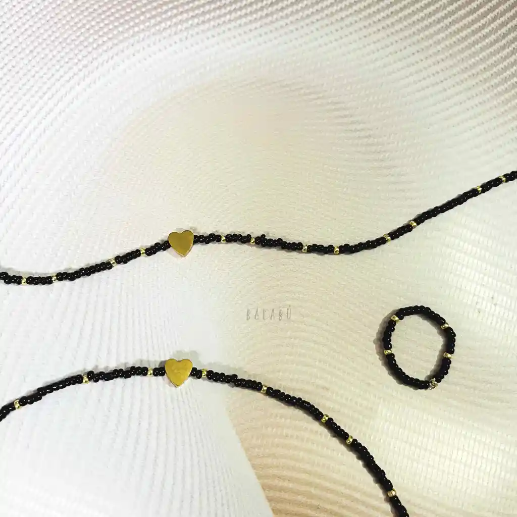Set Collar + Pulsera + Anillo Negro con corazón dorado