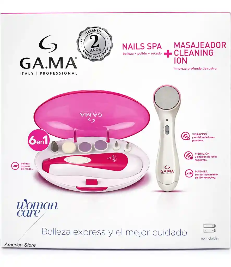 America Store te trae Set De Manicura Spa Portatil + Masajeador Limpiador Gama ¡El set perfecto para potencializar tu belleza al masivo! Compuesto por: Nails SPA 5 en 1 está dotado de 4 accesorios intercambiables que se colocan en la unidad central de accionamiento, además de un palito para las cutículas. Estos son los accesorios que incluye: un disco moldeador pequeño de granulación fina que te permite acortar, limar y darles forma a las uñas de las manos; un disco abrillantador para que luzcas unas uñas brillantes y resplandecientes; un cono moldeador de zafiro que elimina la piel seca, los callos y las durezas de la planta del pie o del talón; un cono pequeño de punta gruesa que lima y suaviza las uñas más gruesas (por ejemplo, las de los pies), eliminando la superficie más dura. Además, el set también incluye un palito para las cutículas. La unidad central de accionamiento está dotada de 2 velocidades y 2 sentidos de rotación y, al funcionar con pilas, permite la máxima libertad de movimiento El masajeador facial Gama Cleaning ION posee un compacto y moderno diseño con luz indicadora de encendido y una práctica botonera deslizante. Cuenta con un movimiento de 150 veces por segundo que acelera el movimiento celular garantizando una piel fresca y una absorción eficiente de los productos de cutis e hidratación que utilices. Vas a poder seleccionar entre dos tipos de funciones: La vibración con emisión de iones positivos, que absorbe la suciedad residual de los poros dejando el rostro limpio, La vibración con emisión de iones negativos que favorece la incorporación de nutrientes para mantener la elasticidad y el vigor de las células de la piel. Masajea la superficie de la piel acelerando el movimiento celular y metabolismo para una piel fresca. Favorece la absorción de productos de cuidado de la piel.