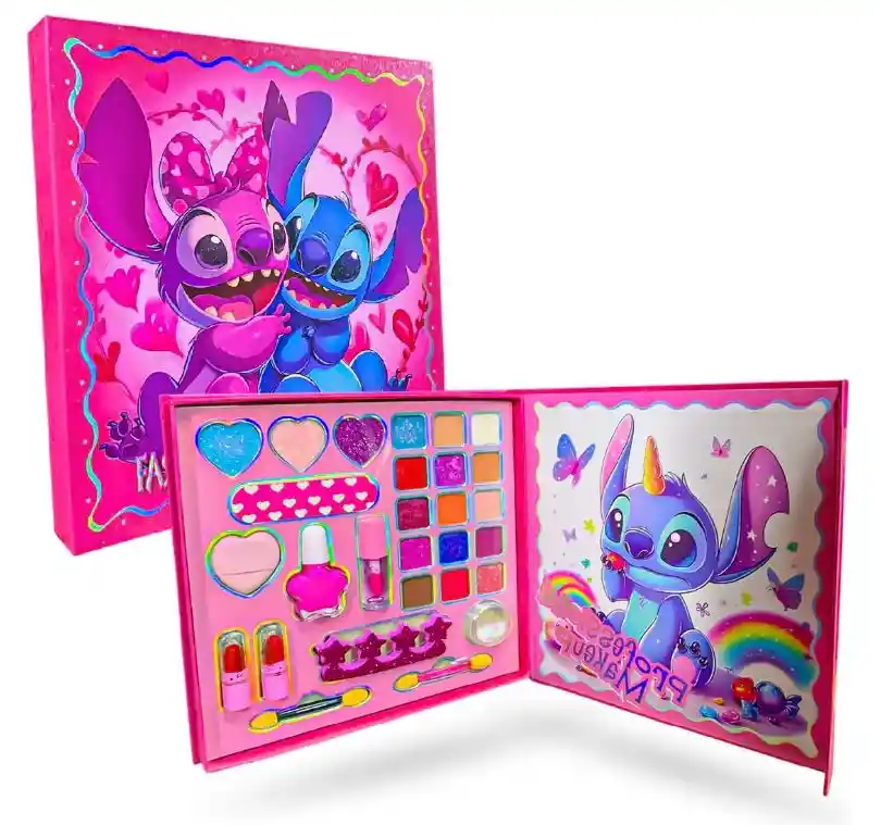 Este kit es uno de los más buscados en Colombia gracias a su diseño adorable, materiales seguros y su presentación de lujo tipo libro con cierre imantado. Perfecto para niñas fashionistas, regalo de cumpleaños, navidad o detalles especiales. ¿Por qué este set es el favorito de las niñas? Incluye todo lo necesario: Sombras, labiales, rubor, glitter, aplicadores, brillo labial, blush y accesorios. Diseño exclusivo Stitch unicornio: Ilustraciones brillantes, colores neón y acabado premium que encantan a simple vista. Estuche con cierre imantado: Se abre como un libro y mantiene el maquillaje organizado y protegido. Colores pigmentados y seguros: Fórmulas suaves aptas para pieles delicadas. Especial para niñas de 3 años en adelante. El regalo perfecto: Una presentación hermosa, elegante y llena de personalidad. Lista para regalar. Fácil de llevar: Su formato tipo cartera permite transportarlo a todas partes sin desorden.