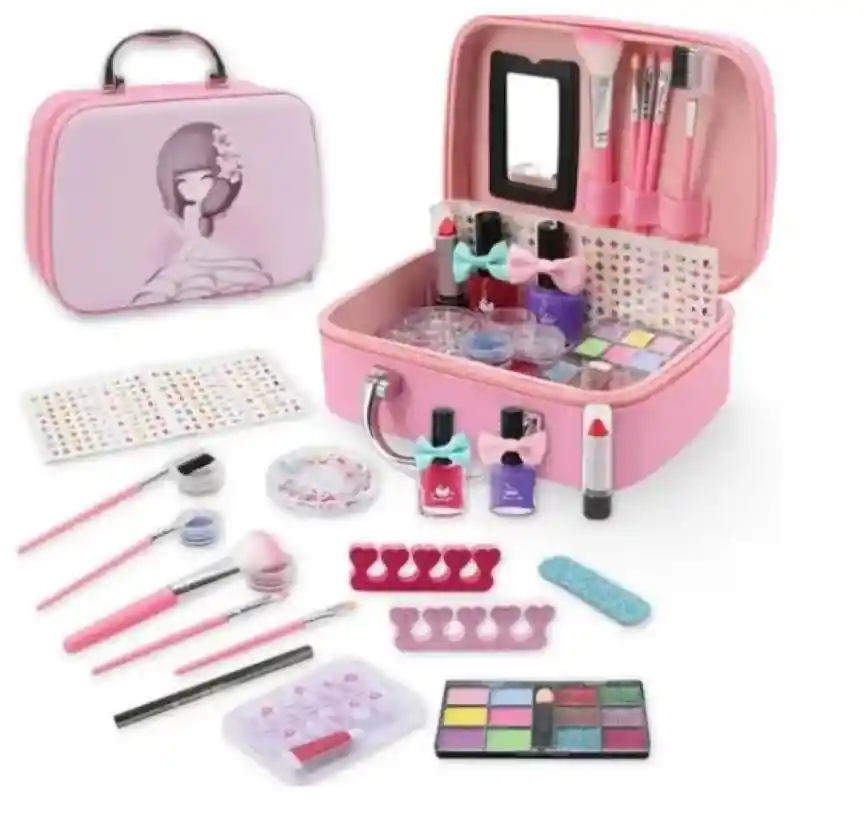 Set De Maquillaje Para Niñas Estuche Cofre CARACTERISTICAS: * Hermoso maletín de diseño moderno y manija para trasporte. * Este estuche de maquillaje de la colección muy completo, compacto para llevarlo siempre contigo. * Lo que necesitas para ojos, labios, manos . * Juguete de maquillaje portátil seguro y lavable para niñas. * Herramientas de maquillaje creativas para el desarrollo. * Fácil de transportar y organizar * Incluye: -2 esmaltes de uñas; -6 opciones para sombras mate; -6 sombras con nácar; -set de manicura; -set de brochas cosméticas / 5 uds. -lápiz labial; -lápiz delineador de ojos; -Lima de uñas; -pegatinas para manicura creativa; -bolso-estuche con asa de metal DESCRIPCION: - Este juego de maquillaje de juguete es ideal para que las niñas exploren su creatividad y se diviertan como adultas. Puede estimular la imaginación y la creatividad de los niños. Lleva a tus hijos al mágico mundo del maquillaje. Set de maquillaje lavable para niñas: el estuche de maquillaje utiliza una fórmula soluble en agua, sin conservantes añadidos, suave y no irritante, sin dañar la piel. Fácil de lavar, no tóxico. Hemos preparado para ti el estuche de maquillaje infantil para niñas con diferentes colores y herramientas, que contiene casi todas las partes necesarias para maquillarse. - Set de maquillaje para niñas con un tamaño del estuche de maquillaje es de 20 cm x 15 cm x 7.5 cm. Cuando está completamente abierto, la longitud es de 11.2 pulgadas. Incluye cosméticos y accesorios, Ya sea para disfrazarse, fiestas y actividades - Las herramientas de maquillaje para niños pueden estimular la creatividad y la imaginación de los niños. Al aplicar colores y diseñar patrones, los niños pueden expresar sus pensamientos y sentimientos, desarrollar su percepción artística y pensamiento creativo. - Interacción social: En ocasiones especiales como fiestas infantiles o celebraciones, las herramientas de maquillaje para niños pueden ayudar a aumentar la diversión de la interacción social. Los niños pueden maquillarse juntos y participar en actividades divertidas. - Fácil de transportar y organizar, El juego de juguetes de maquillaje tiene un práctico diseño portátil para que las niñas puedan jugar con sus juguetes de maquillaje lavables favoritos en cualquier lugar. Perfecto para fiestas de cumpleaños de niñas, juegos de rol, actividades entre padres e hijos, actuaciones escolares y más. La linda bolsa de maquillaje para niñas tiene una gran capacidad para ayudar a los niños a organizar y recolectar juguetes de maquillaje. ESPECIFICACIONES: * Materiales: plástico/ Lona. * Dimensiones: - Ancho: 20 Cm - Largo: 15 cm. - Alto: 7.5 cm
