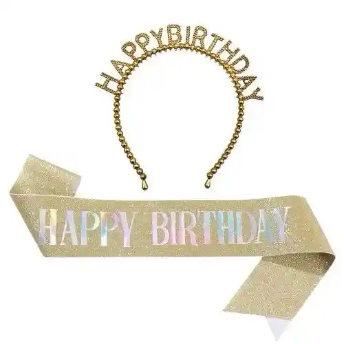 Set Diadema Vincha Con Banda Happy Birthday Dorada