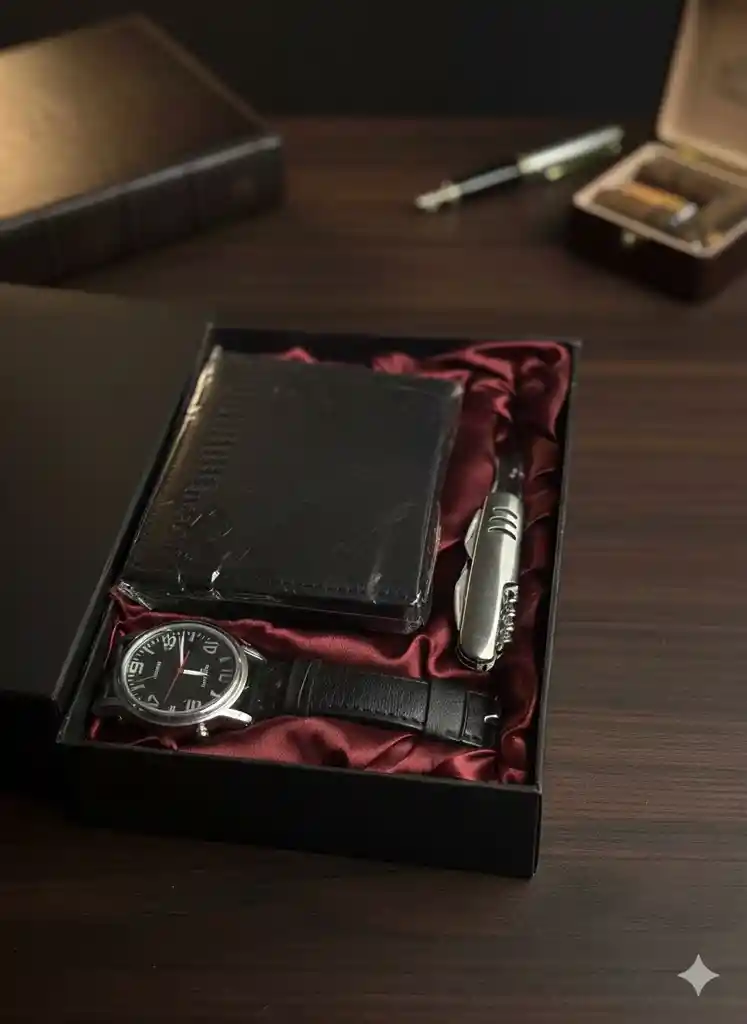 Set para Hombre: Billetera + Bolígrafo + Reloj + Navaja Multiusos Este completo set para hombre combina elegancia, utilidad y estilo en un solo paquete. Es el regalo perfecto para ocasiones especiales como cumpleaños, graduaciones, fechas especiales o simplemente para sorprender con un detalle práctico y sofisticado. Descripción del producto: El set incluye una billetera moderna elaborada en material resistente, un bolígrafo metálico de escritura suave, un reloj de diseño clásico y una navaja multiusos compacta ideal para actividades cotidianas. Cada pieza ha sido seleccionada para ofrecer funcionalidad y una excelente presentación. Características destacadas: Billetera masculina con compartimentos para billetes, tarjetas y documentos. Bolígrafo metálico de escritura fluida y diseño elegante. Reloj para hombre con estilo clásico, cómodo y versátil. Navaja multiusos con herramientas básicas para uso diario. Presentación en caja de regalo, ideal para obsequiar. Set práctico, completo y con excelente relación calidad-precio. Un conjunto pensado para complementar el día a día del hombre moderno, combinando estilo, funcionalidad y buena presentación.