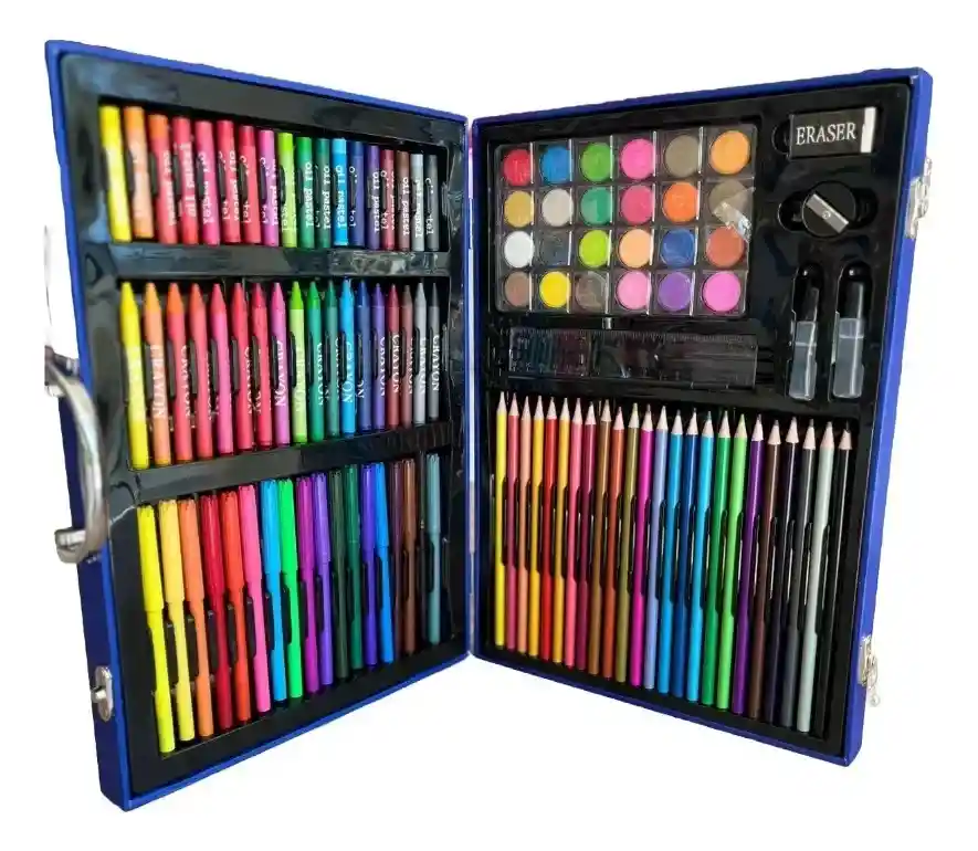 Kit de Arte x 128 piezas, este Kit transforma la creatividad de los más pequeños en una emocionante aventura artística.Características Destacadas: Materiales de Alta Calidad: Esta Maleta incluye todo lo necesario para que un joven artista explore su talento. Desde acuarelas y fibras hasta lápices, crayones, pasteles al óleo, goma y pinceles.Diseño Portátil: Perfecta para llevar a cualquier lugar, la Maleta es ideal para viajes, picnics o actividades en casa. ¡La diversión se puede disfrutar donde sea!. Medida maletín: 35 x 25 x 5cm