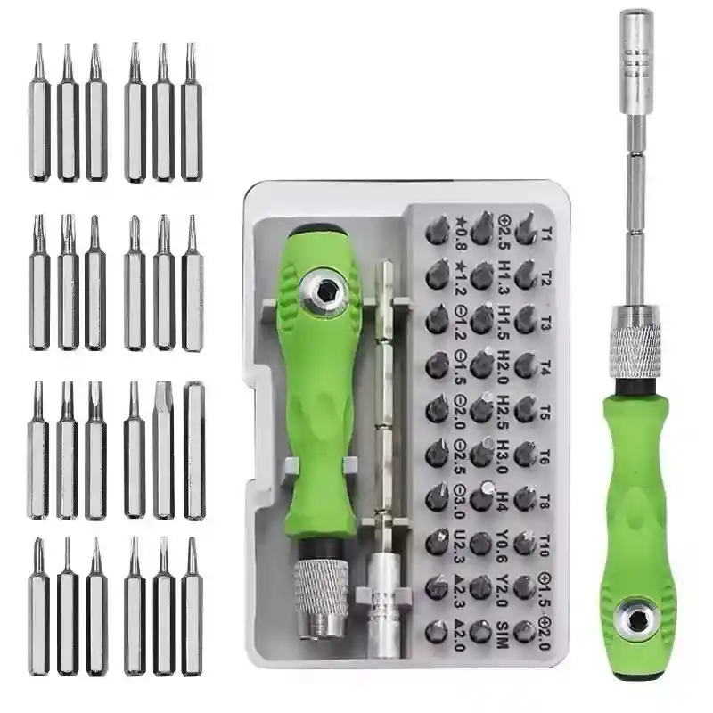 Destornillador de precisión que incluye mango, 30 puntas, prolongador y caja de transporte. Fabricado en acero al cromo vanadio para una alta rigidez. Excelente manejo gracias a un diseño muy bien estudiado. Sistema de doble tapón (las puntas también encajan directamente en el mango del destornillador). Kit de destornillador con torx y 30 piezas intercambiables, ideal para reparaciones electrónicas y de precisión. Ofrece variedad de puntas, mango ergonómico antideslizante, materiales de alta resistencia, estuche organizador y diseño portátil.
