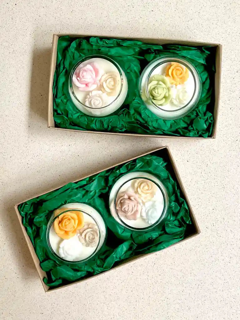Set x 2 velas mini artesanales con flores de cera. Aromas surtidos entre nuestros más vendidos. Incluye empaque de regalo.Los aromas se envían surtidos, entre opciones como: Elixir de Manzana, Brisa de Otoño, Lavanda, Pétalos de Rosa, Vainilla Latte o Vainilla Francesa, Ginger Peach, Canela, Naranja Dulce, entre otros. Aromas no elegibles. Características • Set x 2 velas mini • Flores de cera artesanales en colores variados • Cera vegetal • Pabilo de algodón 🎁 Incluye Empaque de regalo, ideal para sorprender 📏 Especificaciones • Medidas de cada vela: 5 cm de diámetro • Medidas de la caja: 17 x 9,5 cm Hechas a mano en Colombia con amor ❤️ Regalo delicado, listo para entregar.