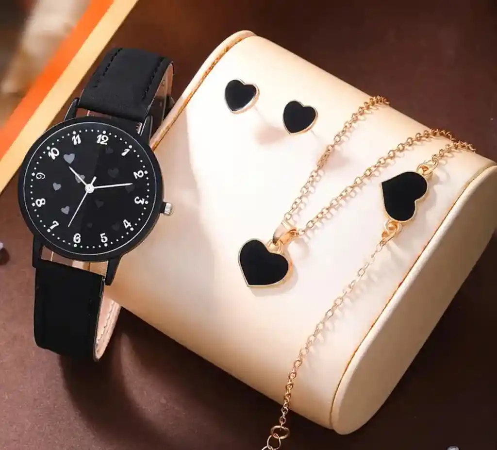 Set Reloj Para Mujer Corazones Con Collar Aretes Rel Lindo kit de reloj para dama con accesorios, ideal para un buen detalle El kit contiene: 1 reloj para mujer con correa en cuero sintético, sistema análogo en su pantalla movimiento cuarzo. INCLUYE 1 juego de collar 1 par de aretes 1 pulsera color: dorado con negro Elaborados en aleación de metal. se recomienda no aplicar cremas directamente, ni perfume para su máximo cuidado y durabilidad. Todo kit se entrega en caja