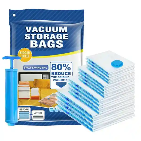 El set incluye 12 bolsas multiuso de plástico transparente y una bomba para extraer el aire. Las bolsas tienen dimensiones de 80 cm de ancho, 100 cm de alto y 100 cm de profundidad, y pueden almacenar hasta 10 kg. Son fáciles de usar: solo guarda el artículo, sella la cremallera doble y usa la bomba para succionar el aire. Además, son resistentes y reutilizables, perfectas para usar en diferentes espacios de tu hogar.