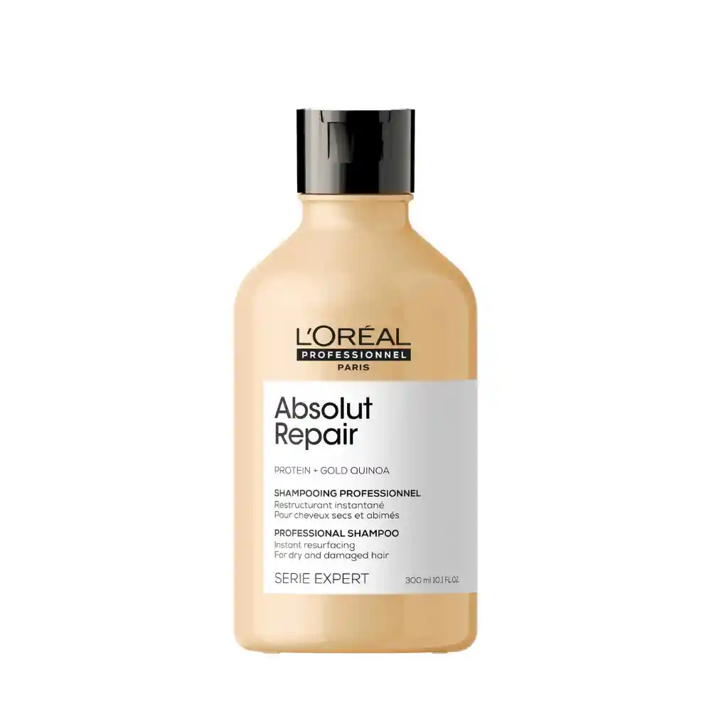 El Shampoo reparador Absolut Repair de L’Oréal Professionnel está formulado para limpiar, reparar y fortalecer el cabello dañado, mejorando visiblemente su apariencia desde el primer uso. Su fórmula profesional actúa sobre la fibra capilar, ayudando a reestructurar el daño mientras mantiene un acabado ligero y suave. Enriquecido con quinoa dorada y proteína, aporta nutrición y resistencia al cabello, dejándolo más manejable, brillante y con una textura sedosa sin sensación pesada. Es ideal para complementar con otros productos de la línea Absolut Repair para potenciar los resultados. Ideal para cabello dañado, seco o debilitado que necesita reparación, suavidad y brillo. Ingredientes clave: - Quinoa dorada: ayuda a fortalecer y proteger la fibra capilar. - Proteínas: contribuyen a reparar y reestructurar el cabello dañado.