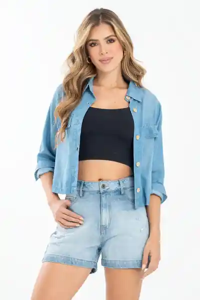 En Denim Rígido 100% Algodón Tiro Alto Tono Claro Con Manualidad Cinco Bolsillos.