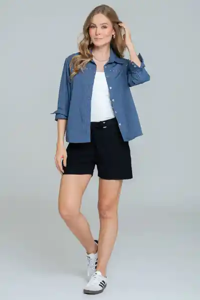 Short en tejido plano fondo entero, pretina delantera, sale cinturón de los costados con argollas sale tiras para anudar, gancho sastre, bolsillos funcionales con boca redonda en la parte delantera, ruedo de 2cms, silueta semi ajustada.