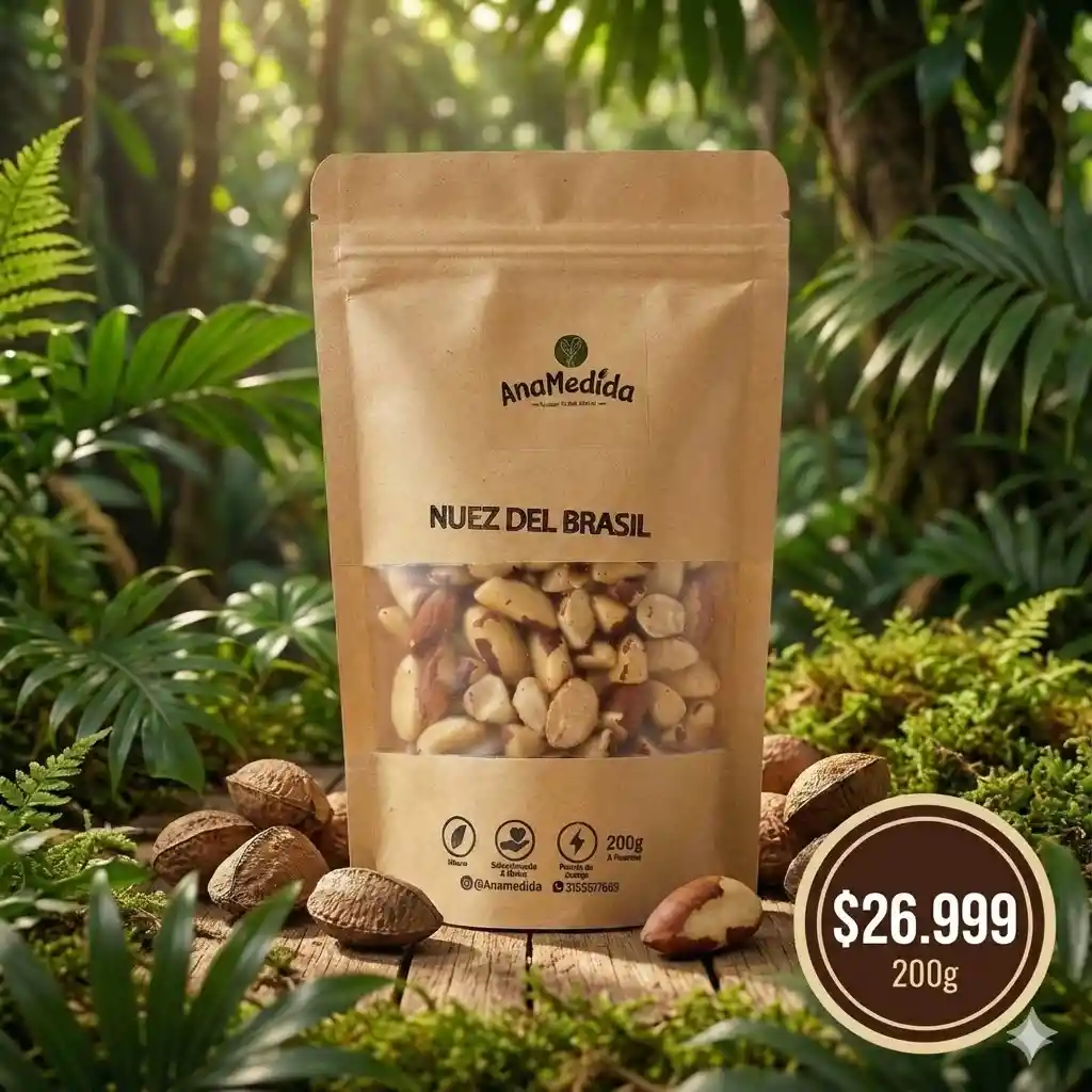 Nuez del Brasil 100% natural, de textura suave y sabor intenso, sin sal añadida ni conservantes. Reconocida por su alto contenido de selenio, mineral clave para el sistema inmune y el bienestar metabólico. Ideal para consumo diario en porciones moderadas, como snack funcional, en mezclas de frutos secos o como complemento de una alimentación equilibrada. Seleccionada cuidadosamente para garantizar frescura, tamaño uniforme y calidad premium. Contenido: 200 g Ingredientes: Nuez del Brasil natural Libre de: aditivos, colorantes y conservantes