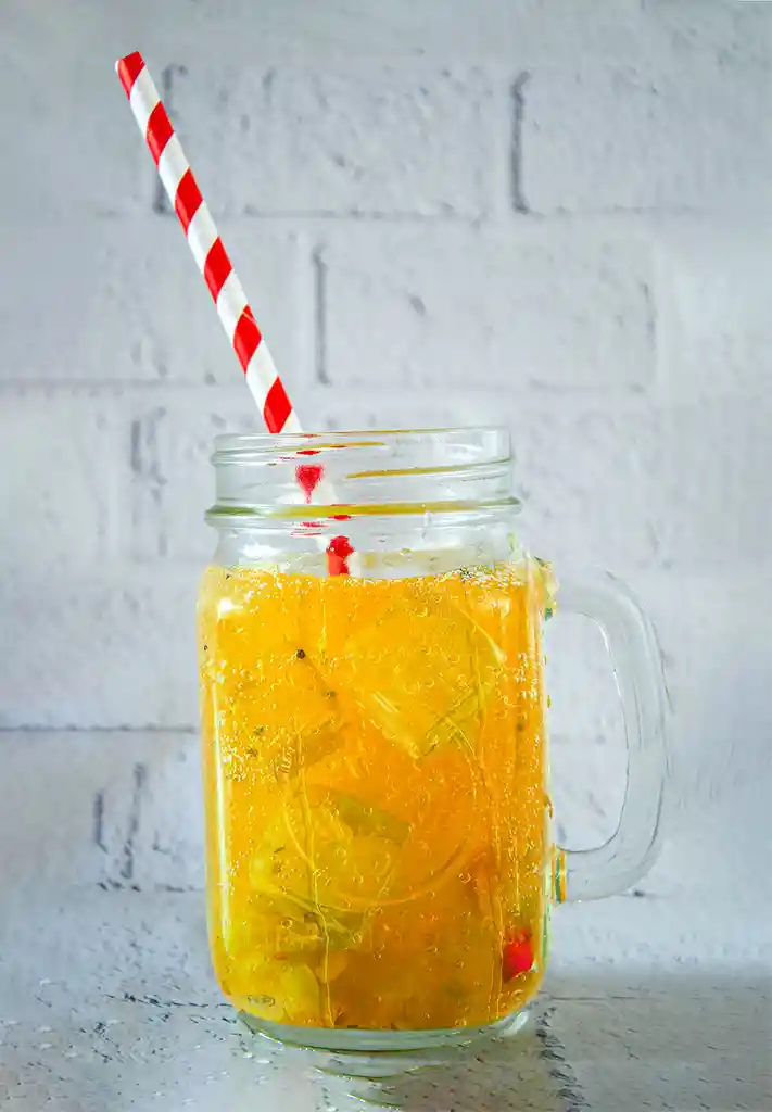 Bebida carbonatada con extracto y trozos de fruta de frutos amarillos