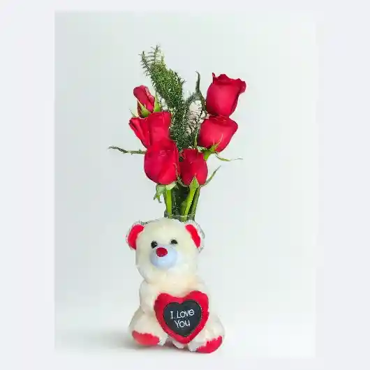 HERMOSO SOLITARIO DE 6 ROSAS CON FOLLAJE DE RUSCO Y SOLEAGO, CON UN PEQUEÑO PELUCHE COLOR CREMA