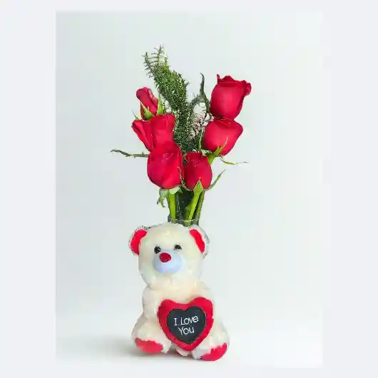 Solitario de 6 rosas rojas, acompañadas de follaje y un peluche pequeño. Nota: La flor puede ser sustituida dependiendo la disponibilidad de color y del producto “Mensaje Personalizado” máximo de 30 caracteres (Dejar el mensaje en el chat, los comentarios no se previsualizan para la tienda por lo que si se dejan allí no podrá ser incluido).