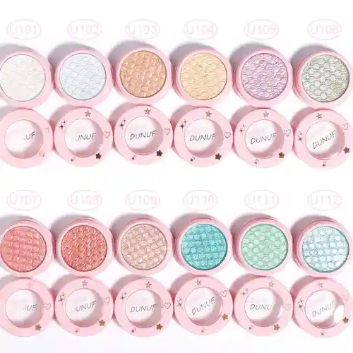 DUNUF Sombra Unitaria Glitter Eyeshadow: Estas sombras son descritas como de alta pigmentación y vitalidad, con un acabado brillante que "hará que tus ojos sean más encantadores". Son de larga duración, resistentes al agua y a las manchas, manteniendo el maquillaje intacto durante mucho tiempo. La textura es suave y fina, lo que facilita su aplicación sin que el polvo se desprenda. Son adecuadas tanto para uso personal diario como para ocasiones especiales como bodas o fiestas.