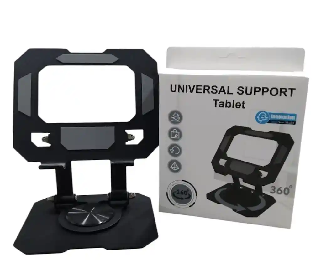 Diseñado para brindar estabilidad y versatilidad, el soporte para tablet 360 permite girar y ajustar la posición de tu dispositivo con facilidad. Rotación de 360° Permite ajustar el ángulo de visión sin puntos ciegos. Ajustable y ergonómico: La altura y el ángulo se pueden modificar para una postura cómoda, aliviando el dolor de espalda y la rigidez del cuello. Material resistente: Fabricado con materiales como acero al carbono y aluminio para mayor durabilidad y estabilidad. Plegable y portátil: Su diseño compacto lo hace fácil de transportar y almacenar. Amplia compatibilidad: Adecuado para tabletas y teléfonos celulares de varias pulgadas.