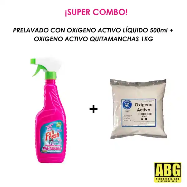 El remover de Manchas Prelavado cuenta con una formula biodegradable , es un efectivo desmanchador que gracias a su formula con Oxígeno activo remueve y limpia las prendas sin afectar los tejidos o acabados de las prendas, úselo en ropa blanca y de color, remueve manchas orgánicas como: vino, café, pasto, chocolate, salsa de tomate, sangre, entre otros. Y el Oxígeno activo o per carbonato de sodio es un blanqueador, desmanchador que se usa para ropa blanca, de color y para limpieza de superficies. En conjunto, el Remover de Manchas Prelavado y el Oxígeno Activo forman un sistema integral de alto desempeño para la eliminación de manchas difíciles. Mientras el prelavado actúa directamente sobre la mancha desprendiéndola de las fibras, el oxígeno activo potencia el lavado y asegura una limpieza profunda, logrando prendas más limpias, sin residuos y sin afectar tejidos ni acabados.