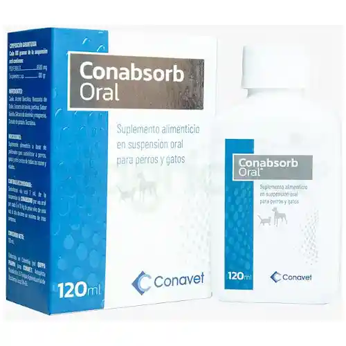 Conabsorb es un suplemento nutricional de origen natural, formulado para favorecer la integridad y funcion digestiva de los animales. Versátil y fácil de usar de administración directa vía oral o en el alimento Seguro para cachorro y animales jóvenes INDICACIONES COMO NUTRACÉUTICO Animales que presenten diarreas o heces inconsistentes de origen inespecificas. Los polifenoles contenidos en el extracto de taninos cumplen la función nutracéutica en el control ¨no antibiotico” de patógenos.. Nutracéutico coadyudante en pacientes con sintomas de mala absorción, enfermedades digestivas o infecciosas que cursen con inconsistencia fecal o diarreas.