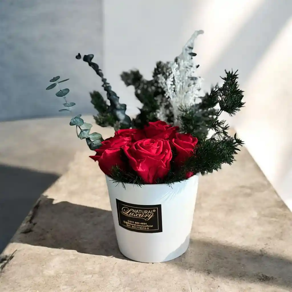 Arreglo de 5 rosas preservadas con follaje en base decorativa de cerámica blanca. Elegante y duradero, ideal para regalar y decorar sin mantenimiento.