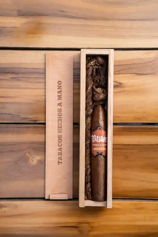 Bribón Cigars Bribón Belicoso es un cigarro artesanal colombiano elaborado con hojas de tabaco cultivadas y seleccionadas cuidadosamente para ofrecer una experiencia intensa y equilibrada. Está hecho con tabaco de origen colombiano, con mezcla y fermentación que le dan un perfil clásico y con sabor profundo. Se presenta individualmente con formato Belicoso (aprox. 5″ × 52), con una fumada estimada de 30 – 45 minutos y notas ricas que evocan la tradición tabacalera de Barichara, Santander.