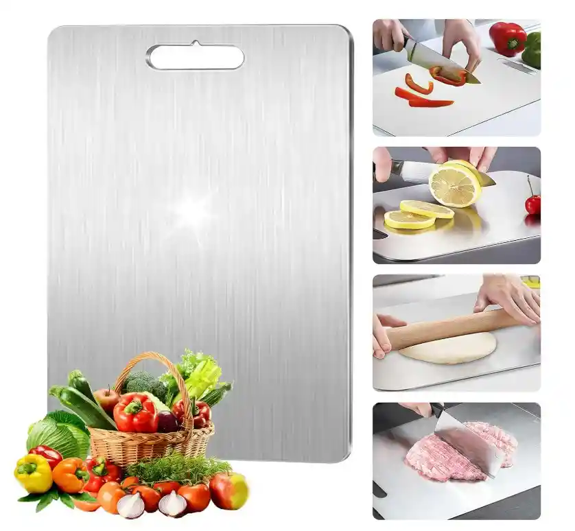 𝙏𝘼𝘽𝙇𝘼 𝘿𝙀 𝘾𝙊𝙍𝙏𝘼𝙍 𝘿𝙀 ACERO INOXIDABLE :La tabla de cortar presenta una superficie de ACERO optimizada que ofrece una resistencia y durabilidad incomparables. Su estabilidad superior y sus propiedades antimicrobianas previenen eficazmente cortes, astillas y perforaciones a lo largo del tiempo, lo que la convierte en una opción ideal para la cocina de alta intensidad: un aliado indispensable en tu cocina. 𝘿𝙄𝙎𝙀Ñ𝙊 𝘿𝙀 𝘿𝙊𝘽𝙇𝙀 𝘾𝘼𝙍𝘼:En comparación con las tablas de cortar de plástico y madera tradicionales, las tablas priorizan la seguridad. Son completamente libres de BPA y productos químicos nocivos, sin partículas de plástico. El diseño incluye un lado para cortar frutas y verduras y un lado para cortar carne, evitando eficazmente la contaminación cruzada. Esto protege la salud de tu familia y asegura que cada comida sea fresca e higiénica. 𝙇𝙄𝙈𝙋𝙄𝙀𝙕𝘼 𝙔 𝘼𝙇𝙈𝘼𝘾𝙀𝙉𝘼𝙈𝙄𝙀𝙉𝙏𝙊 𝙁Á𝘾𝙄𝙇𝙀𝙎:La tabla de cortar de acero inoxidable ofrece excelentes capacidades de limpieza, ya que no absorbe residuos de alimentos ni líquidos. Un simple paño húmedo es todo lo que se necesita para prepararla para su próximo uso. El diseño único del mango permite colgarla fácilmente, manteniendo la tabla limpia y reduciendo significativamente el desorden en la cocina, mejorando la organización general. 𝙋𝙍𝙊𝙏𝙀𝙂𝙀 𝙏𝙐𝙎 𝘾𝙐𝘾𝙃𝙄𝙇𝙇𝙊𝙎 𝙔 𝙈𝘼𝙉𝙏𝙀𝙉𝙇𝙊𝙎 𝘼𝙁𝙄𝙇𝘼𝘿𝙊𝙎:Nuestras tablas de cortar de titanio están diseñadas para proteger tus cuchillos durante su uso, evitando que se desafilen en comparación con la piedra, el vidrio o el acero. Disfruta de cortar y picar sin la molestia de afilar tus cuchillos con frecuencia, lo que la convierte en una elección inteligente para los entusiastas de la cocina. 𝙋𝘼𝙍𝘼 𝙉𝙀𝘾𝙀𝙎𝙄𝘿𝘼𝘿𝙀𝙎 𝘿𝙄𝘼𝙍𝙄𝘼𝙎:Recibirás una tabla de cortar de 39 x 29 cm, que no solo es la elección ideal para la cocina, sino también perfecta para acampar, fiestas y diversas ocasiones