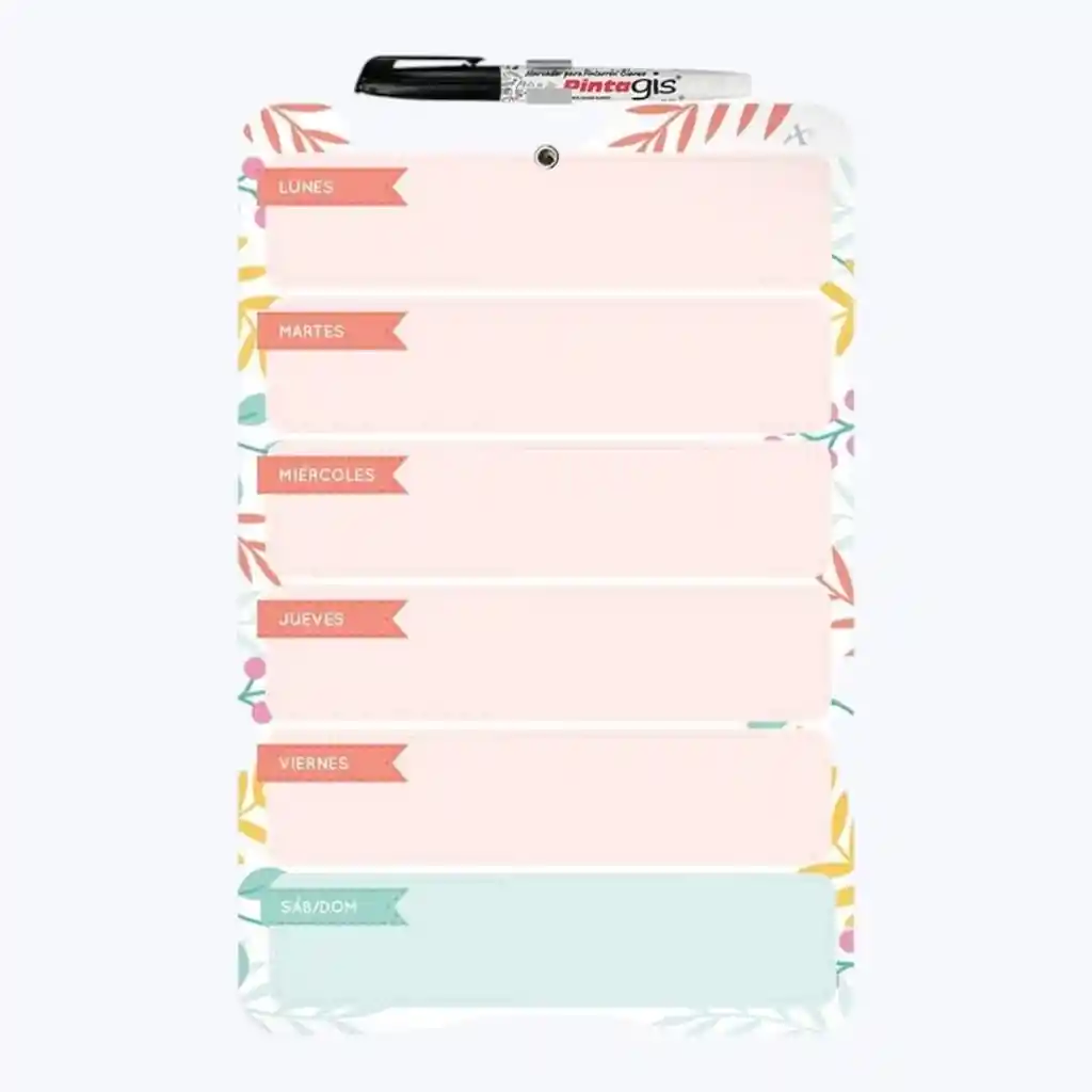 *Permite planear y organizar actividades en la oficina o el hogar. *Cuenta con secciones para los siete días de la semana. *Tiene un diseño sin marco con bordes redondeados. Características *Superficie con borrado en seco. *Cuenta con secciones para los siete días de la semana. *Diseño impreso en superficie. *Ligero, ideal para el hogar y oficina *Incluye marcador. *Medidas: 20cm x 30 cm.