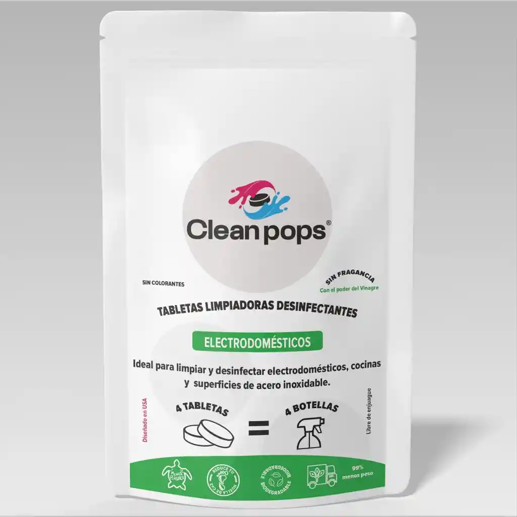 Las tabletas Cleanpops para electrodomésticos y superficies de acero inoxidable están formuladas con vinagre en polvo para limpiar, desodorizar y mantener higiénicas las superficies. Sin fragancias y sin dañar materiales delicados. Presentación: Bolsas con 4 tabletas y cada una rinde 500 ml. Ideales para limpiar: ✔ Refrigeradores y neveras ✔ Microondas ✔ Licuadoras y procesadores ✔ Cafeteras ✔ Air fryers y hornos eléctricos ✔ Campanas extractoras ✔ Electrodomésticos y superficies de acero inoxidable Características destacadas ✔ Vinagre concentrado en formato sólido (SIN OLOR) ✔ Ayuda a eliminar grasa ligera y malos olores ✔ Sin fragancia añadida ✔ Cada tableta rinde 500 ml de solución de limpieza Beneficios clave ✔ Limpieza efectiva sin químicos agresivos ✔ Ideal para cocinas y áreas de preparación de alimentos ✔ No deja residuos ni aromas intensos ✔ Alternativa liviana a los limpiadores líquidos tradicionales ✔ Compatible con acero inoxidable, vidrio, cerámica y plástico ✔ Ahorra espacio, agua y dinero Modo de uso (fácil y rápido) 1️⃣ Llena una botella o recipiente con 500 ml de agua 2️⃣ Agrega 1 tableta Cleanpops 3️⃣ Espera a que se disuelva completamente 4️⃣ Aplica sobre la superficie 5️⃣ Limpia con un paño de microfibra 👉 No requiere enjuague, lo que te permite ahorrar agua.