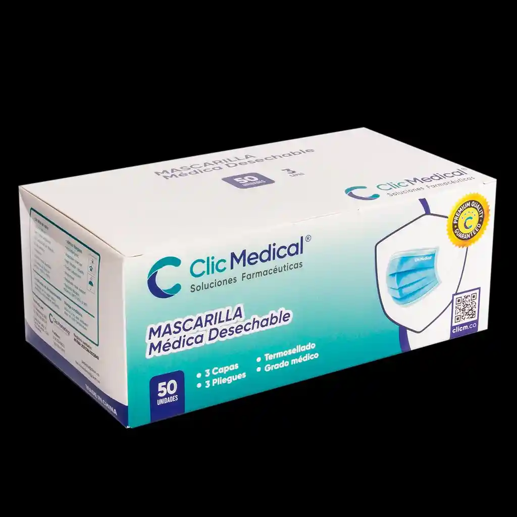 Mascarilla grado médico desechable, termosellado, con tres capas, tres pliegues y barra nasal para ajuste anatómico. En presentación de empaque por 50.