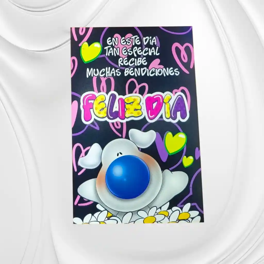 Una tarjeta alegre y colorida para desear un feliz día lleno de bendiciones. Ideal para amistades, familiares o cualquier persona a quien quieras regalarle una sonrisa y buena energía.