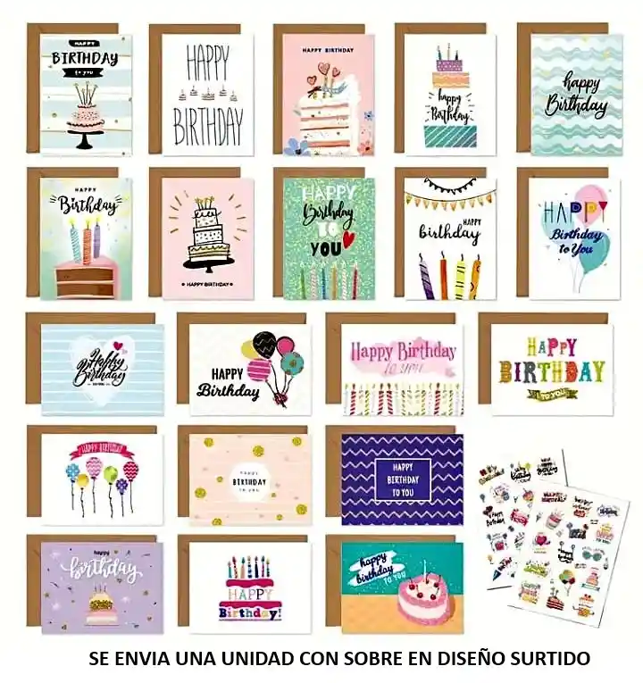 Tarjeta de feliz cumpleaños con sobre. MEDIDA TARJETA 7.5x10cmi APROX MEDIDA SOBRE 11.5X8CM. SE ENVIA UNA TARJETA EN DISEÑO SURTIDO CON SOBRE Y STICKER PARA SELLAR EL SOBRE