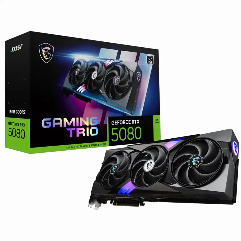 Arquitectura de Alto Rendimiento : Impulsada por la última arquitectura de NVIDIA, la GeForce RTX 5080 ofrece un rendimiento excepcional para gaming y creación de contenido, incorporando tecnologías avanzadas de IA y compatibilidad con DLSS 4. Memoria 16GB GDDR7 : Equipada con memoria GDDR7 ultrarrápida de 16GB, que proporciona mayor ancho de banda y un desempeño fluido en juegos exigentes, texturas en alta resolución y tareas profesionales. Sistema de Refrigeración TRI FROZR : El avanzado sistema de enfriamiento TRI FROZR de MSI incorpora ventiladores de alto rendimiento y un flujo de aire optimizado para mantener bajas temperaturas con un funcionamiento silencioso. Diseño Gaming Premium : La serie GAMING TRIO destaca por su construcción robusta, backplate reforzado e iluminación RGB que aporta durabilidad y una estética gamer moderna.