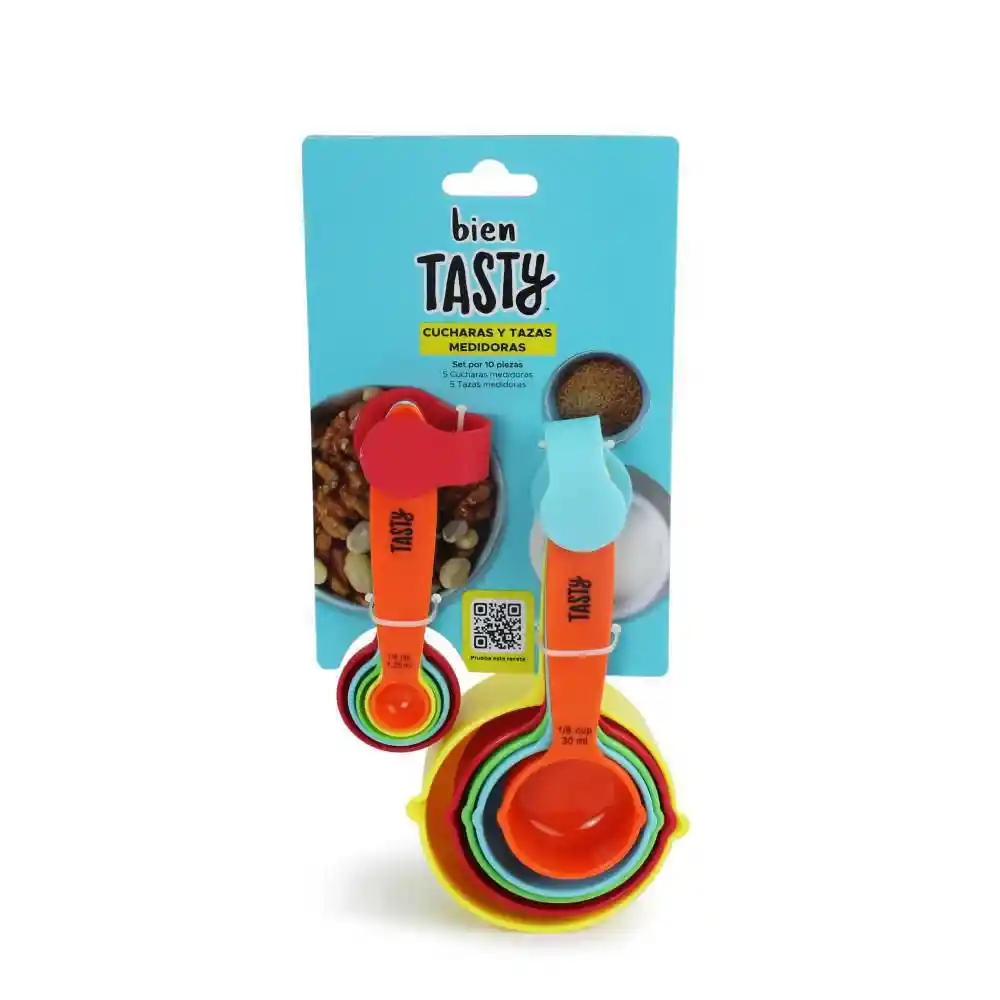 Set Incluye: Tazas 5 Und + Cucharas 5 Und. Cucharas y Tazas Medidoras. Material: Plástico. Marca: Tasty. Medidas: 1 Cucharada. 1/2 Cucharada. 1/4 Cucharada. 1 Cucharadita. 1/2 Cucharadita. 1 Taza. 1/2 Taza. 1/3 Taza. 1/4 Taza y 1/8 Taza.