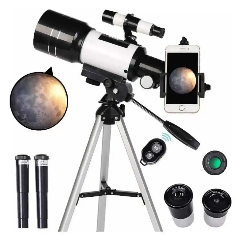 Telescopio Astronómico Profesional Estrellas Soporte Un telescopio refractor es un sistema óptico centrado, que capta imágenes de objetos lejanos utilizando un conjunto de lentes en las que la luz se refracta. La refracción de la luz en la lente del objetivo hace que los rayos paralelos, procedentes de un objeto muy alejado (en el infinito), converjan sobre un punto del plano focal. Esto permite mostrar los objetos lejanos mayores y más brillantes. Telescopio Astronómico, HD Telescopio de refracción de 70 mm con Adaptador de Teléfono, Filtro de Luna, 2 oculares, Control inalámbrico y Trípode de 38 cms Descripción: El trípode está hecho de aleación de aluminio, que es ligero y duradero, y la almohadilla antideslizante en la parte inferior es adecuada para varios terrenos. La rueda de enfoque se usa para ajustar la distancia focal y la palanca de ajuste se usa para ajustar el ángulo del telescopio. Observar el sol requiere el uso de película Bard para evitar dañar los ojos.( no incluida ) . Los filtros solares debe comprarlos por aparte. No estan incluidos Al observar la luna, debe usar el filtro lunar, que puede reducir el reflejo de la luz y ver con mayor claridad. Especificación: Dimensiones del paquete del artículo: 49 * 17 * 24 cm Peso del paquete: 2,4 kilogramos Longitud focal máxima: 300 mm Diámetro objetivo de la lente: 70 mm Ampliación máxima: 150 (distancia focal de la lente del objetivo / distancia focal del ocular * múltiple de Barov = ampliación máxima) El paquete incluye: