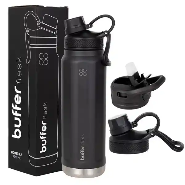 Una botella diseñada para acompañarte en todas tus aventuras ¡pero de la forma más cómoda! Tu Buffer es la solución para beber tus tragos favoritos en todo lugar y a toda hora. - Más práctica: La botella buffer de 700 Ml. Cuenta con 2 tapas para intercambiar cuando desees, así poder tomar líquidos fríos y calientes, todo con una misma botella. - Forma hexagonal: para un mejor agarre de tu botella, te permitirá llevarla cómodamente en tu mano sin necesidad de esfuerzo alguno. - Larga duración de tus bebestibles: Mantiene tus líquidos fríos 24 hrs y Calientes durante 12 hrs - Más Ecológico: olvídate de desechar vasos plásticos, lleva tu vaso contigo y coopera con cuidar el planeta - Resistente, duradero y anti derrames: fabricado con los mejores materiales, durará más años sin abollarse ni oxidarse. Además, cuenta con su tapa anti derrames para evitar accidentes. - Fácil de lavar y no retiene olores. - Libre de BPA - Acero inoxidable de alta calidad: su acero 18/8 (Acero inox 304) no se corroerá ni oxidará. Disponible en los colores Ivory, Negro, Turquesa, Blue Verdi, Sage green, Cool Grey, Lila Power o Azul, elige tu favorito en el botón “elige tu color” --------------------------------------------------------- FICHA TÉCNICA - Incluye 2 tapas intercambiables - Capacidad: 700 ml - Libres de BPA - Material Interior: Acero 100% inoxidable 304 - Colores: Ivory, Negro, Turquesa, Blue Verdi, Sage green, Cool Grey, Lila Power o Azul. - Medidas: 28 cm x 8 cm - Peso: 410 grs --------------------------------------------------------- QUE VIENE EN LA CAJA - 1 Botella buffer 700 ml - 2 Tapas intercambiables - 1 Pitillo plástica reutilizable ------------------------------------------------------------ ¿QUÉ TAPAS INCLUYE? 1. Pitillo: ideal para bebidas frías, esta cómoda tapa incluye un Pitillo para beber tus líquidos favoritos. 2. Rosca pequeña: Permite el paso de sorbos más pequeños de agua, ideal para utilizar en movimiento. **BUFFER® es distribuida en Colombia y Sudamérica exclusivamente por Builder Commerce SAS** ------------------------------------------------------------- PREGUNTAS FRECUENTES: ¿Cómo puedo lavar mi botella? Evita elementos abrasivos para no dañar las superficies. Te recomendamos usar nuestro kit de limpieza de botellas ¿Es anti derrame? Si, las botellas Buffer cuentan con un sistema seguro antiderrame, puedes llevarla en tu mochila sin riesgo de fugas.