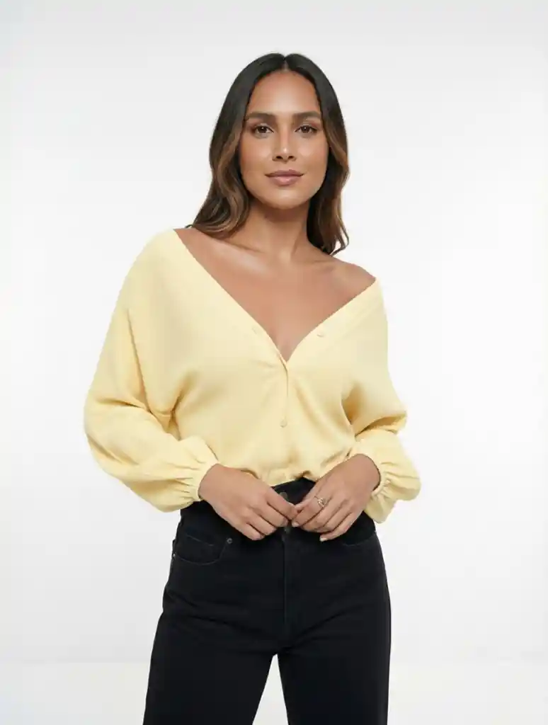 Si tu cuello es muy corto o eres muy bajita los escotes en V se alargan y estilizan todo tu torso y rostro, haciéndote ver más largo. Y si eres alta, verás tu cuello muy elegante y puedes combinarlo con cadenas en V para complementar tu look. Su tela es súper fresca así que es perfecta para todo tipo de climas calientes y fríos. Esta blusa cuello en V con mangas amplias es un imperdible en tu armario si la usas con un pantalón de tiro alto y tacones es perfecta para una cena elegante. O con tenis y jean amplio de tiro alto estarás muy cómodo sin sacrificar la elegancia. Hecho responsablemente por mujeres colombianas. Material: 93% Poliéster y 7% Elastano. El modelo usa talla Única y mide 1.60