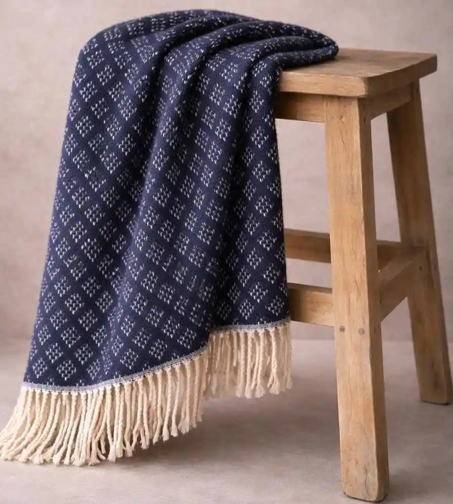 Disfruta de la suavidad y el confort de nuestra Throw Kioto Navy. Elaborada con materiales de alta calidad, ofrece una textura sumamente agradable al tacto, ideal para añadir calidez y un toque de elegancia a cualquier espacio. Su durabilidad y resistencia la convierten en el complemento perfecto para tu hogar. Características: Materiales: 60% algodón 30% acrílico 10% poliéster Medidas: 200 x 150 cm. Por su alto contenido de algodón, estas mantas pueden presentar una ligera reducción (1 a 2 cm) después del primer lavado, lo cual es completamente normal en fibras naturales.