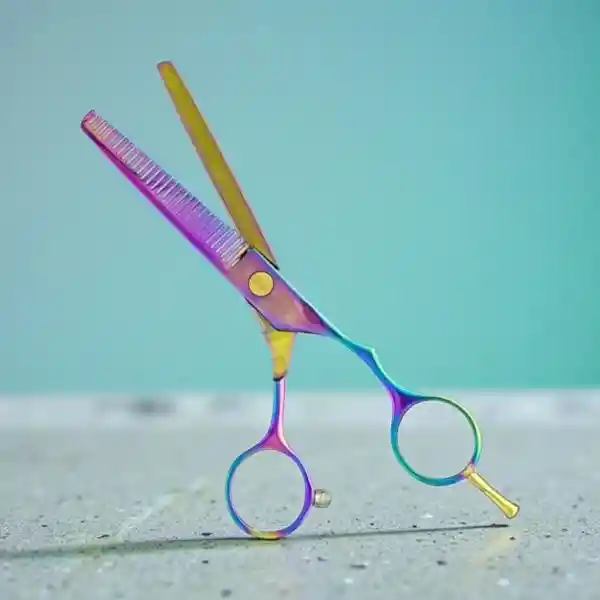 Tijera en acero inoxidable. Estas tijeras potencian la creatividad del corte, ademas son ergonomicas y estan especialmente pensadas para evitar lesiones en la muñeca y mano permitiendo una posición natural a la hora de cortar. Las tijeras son de 6" y vienen en color tornasol. Estas tijeras permiten bajar el volumen y crear cortes definidos.