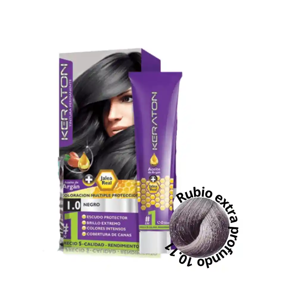 TINTE PERMANENTE KERATON CON ACEITE DE ARGAN Y JALEA REAL. 10.11 RUBIO CENIZO EXTRA CLARO PROFUNDO CONTIENE: - Tintura de 60ml. - Crema Oxidante 60ml. - Tratamiento en sachet x 30ml para después de la tintura. DESCRIPCIÓN: Coloración capilar permanente en crema que proporciona una completa protección al cabello duran el proceso de coloración, gracias a su formulación con: ACEITE DE ARGAN rico en acido grasos como el omega 3, 6 y 9 el cual crea una nutrición excepcional en la fibra capilar debido a su poder antioxidante y complementado con la JALEA REAL la cual contiene una altísima concentración de nutrientes esenciales como glúcidos, proteínas, lípidos, vitamina B y E, ácido fólico, oligoelementos, sales minerales y aminoácido, entre otros componentes que nutren el cabello rápidamente devolviéndole el brillo, la sedosidad y la hidratación, protegiéndolo de las agresiones externas del clima. Gracias a esos dos activos naturales, KERATON TINTURA PERMANENTE ofrece finalmente una coloración múltiple y una protección antes, durante y después del proceso de coloración.