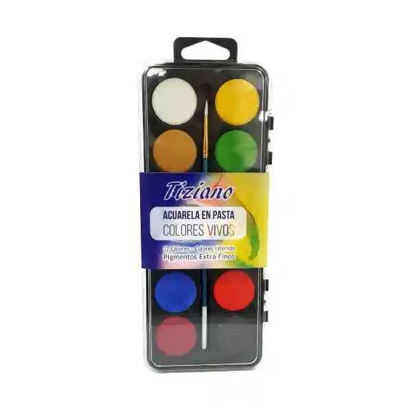 Set Tiziano Incluye Acuarela en Pasta Colores Vivos 12 Und + Pincel 1 Und. Variedad de Colores Mezclables Entre Si, Intensos y Vibrantes, Diferentes Presentaciones Para Todas Las Necesidades.