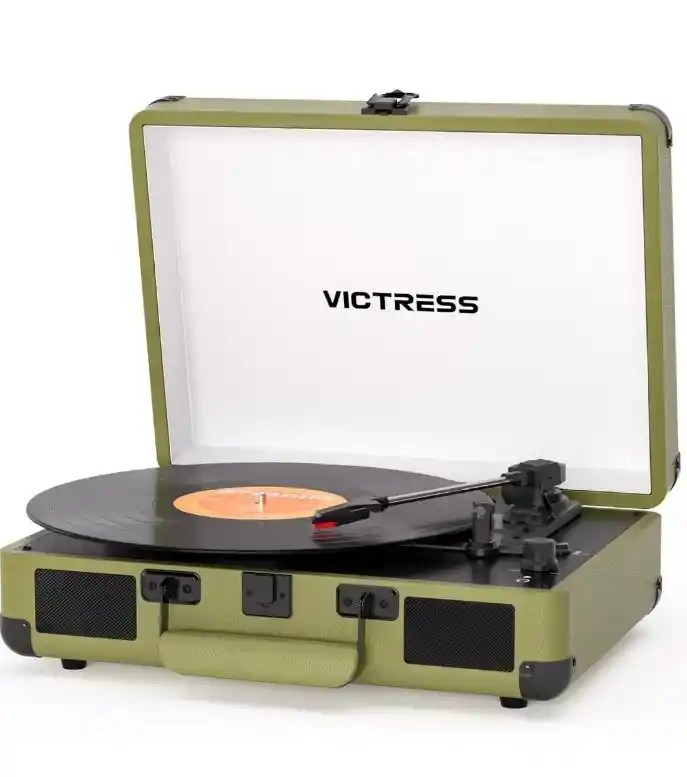 TÍTULO: Tocadiscos para vinilo con altavoces incorporados, salida Bluetooth, 3 velocidades accionadas por correa, tocadiscos retro portátil tipo maletín LP, grabación USB – Color Verde Oliva DESCRIPCIÓN: Déjate envolver por el encanto del sonido clásico con este elegante tocadiscos retro tipo maletín en color verde oliva, una pieza que combina estilo vintage con funciones modernas para que disfrutes tu música como nunca. Su diseño portátil y acabado suave lo convierten en un accesorio decorativo único, perfecto para cualquier habitación, estudio o espacio creativo. Cuenta con altavoces incorporados, por lo que podrás reproducir tus vinilos sin necesidad de equipos adicionales. Además, su conectividad Bluetooth te permite escuchar tu música favorita desde el celular de forma inalámbrica. También incluye grabación USB, ideal para conservar tus discos en formato digital y llevar tu colección a todas partes. Sus 3 velocidades permiten reproducir diferentes tipos de vinilos, mientras que su sistema accionado por correa ofrece una reproducción estable y silenciosa. Todo esto dentro de un maletín compacto, resistente y fácil de transportar. Beneficios destacados: Diseño vintage en hermoso color verde oliva Función Bluetooth para reproducir música desde tu celular Altavoces integrados de sonido claro Grabación USB para convertir vinilos a MP3 Portátil, ligero y perfecto para decorar o regalar Ideal para coleccionistas, amantes del vinilo o quienes quieran iniciar en este mundo Contenido: Tocadiscos tipo maletín Cable USB Manual de usuario Garantía del vendedor: 20 días por defectos de fábrica. No aplica en caso de mal uso, humedad, golpes o manipulación inadecuada. Es necesario conservar el empaque y la factura de compra.