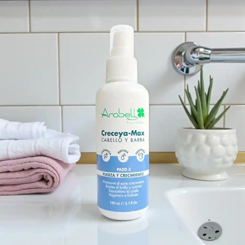 El producto es un tónico capilar y para barba Arobell Creceya-Max. Sus características clave son: Estimula y fortalece el crecimiento saludable del cabello y la barba. Formulado con ingredientes naturales, incluyendo biotina, caléndula y pantenol. Ayuda a mitigar la caída del cabello y a fortalecer los folículos pilosos. Aporta brillo, suavidad e hidratación al cabello. Se aplica sobre el cuero cabelludo o barba limpios, no requiere enjuague y se usa dos veces al día para mejores resultados